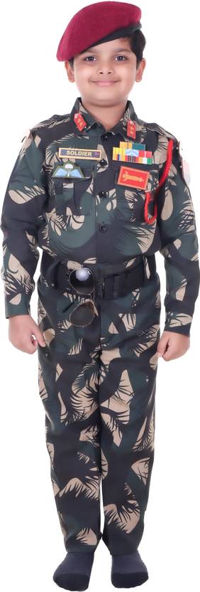 ARMY DRESS FOR KIDS: Raj Costume's military dress is crafted to instil pride and honour upon wearing. Our military costume comes in a Set of 3, a Set of 7, a Full Set with 14 pcs, and a Full 14pc set upgraded with a beret cap. Our military dress is available in multiple sizes to fit from 3year old to adults. BE READY FOR ANY OCCASION: This republic day dress for kids comes in two prints; the old jungle print and the new print of the army uniform. This army dress for girls makes an excellent choice for wearing on Republic Day, School Annual Function, Theme Party, Stage Shows, Fancy Dress Competitions, or baby costume for photography. PROFESSIONAL & REAL-LIKE ACCESSORIES: Our army uniform for kids also comes with a Set of 9 Badges, a high-quality Red Dori (Lanyard), a high-quality and professional-looking Belt, a Cap that can be worn by a child later on also, and a Beret Cap that a high professional feel to the kid coupled with other professional accessories. PREMIUM-QUALITY MATERIALS: Our soldiers dress for kids are made using high-quality polyester fabric, which is strong, resilient, and durable. The lightweight fabric remains lightweight on your body and can be worn for hours. Our military costume is resistant to stretching and shrinking, ensuring long-lasting usage. EASY TO CARE FOR AND MAINTAIN: It is recommended to dry clean the costume to ensure that it stays in pristine condition. Do not iron directly on the print as this may damage the design. Please note that the actual colour of the costume may vary slightly from the photographs due to lighting and monitor settings.