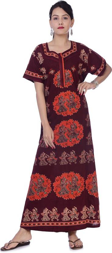 This is A new item And Different Item COTTON Printed Nightwear Gown. These Nightwear are made from cotton that further adds comfort to them. Made with 100 % soft cotton to keep you cool all throughout. This is a beautifully designed Cotton Night Gown. These colourful Full Length Night Gown makes you feel comfortable and relaxed all night long. It also ensures maximum breathability and a soft feel, courtesy the pure Cotton fabric. This nighty features a Sweetheart Neck with short sleeves. 1 Set = 1 Item , Material - COTTON , Length-56 inches, bust-44 inches , Size - Free Size. Wash Care Instructions: Gentle wash It will make you feel pretty and pampered all at the same time