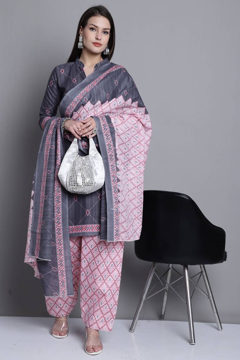 Beautiful Suit look pretty like never before.Wearing this Grey Color Suit which made from Rajnandini with Peach Colored Printed Cotton Blend Bottom and Grey & Peach Colored Cotton Blend Dupatta.Suit has also decorative work like Top - Block Print, Bottom - Block Print And Dupatta - Block Print.This beautiful suit features a classy Printed Work all over,which makes it a smart pick for all occasions. You can wear this Suit in different styles. You can wear it occasionally or casually.