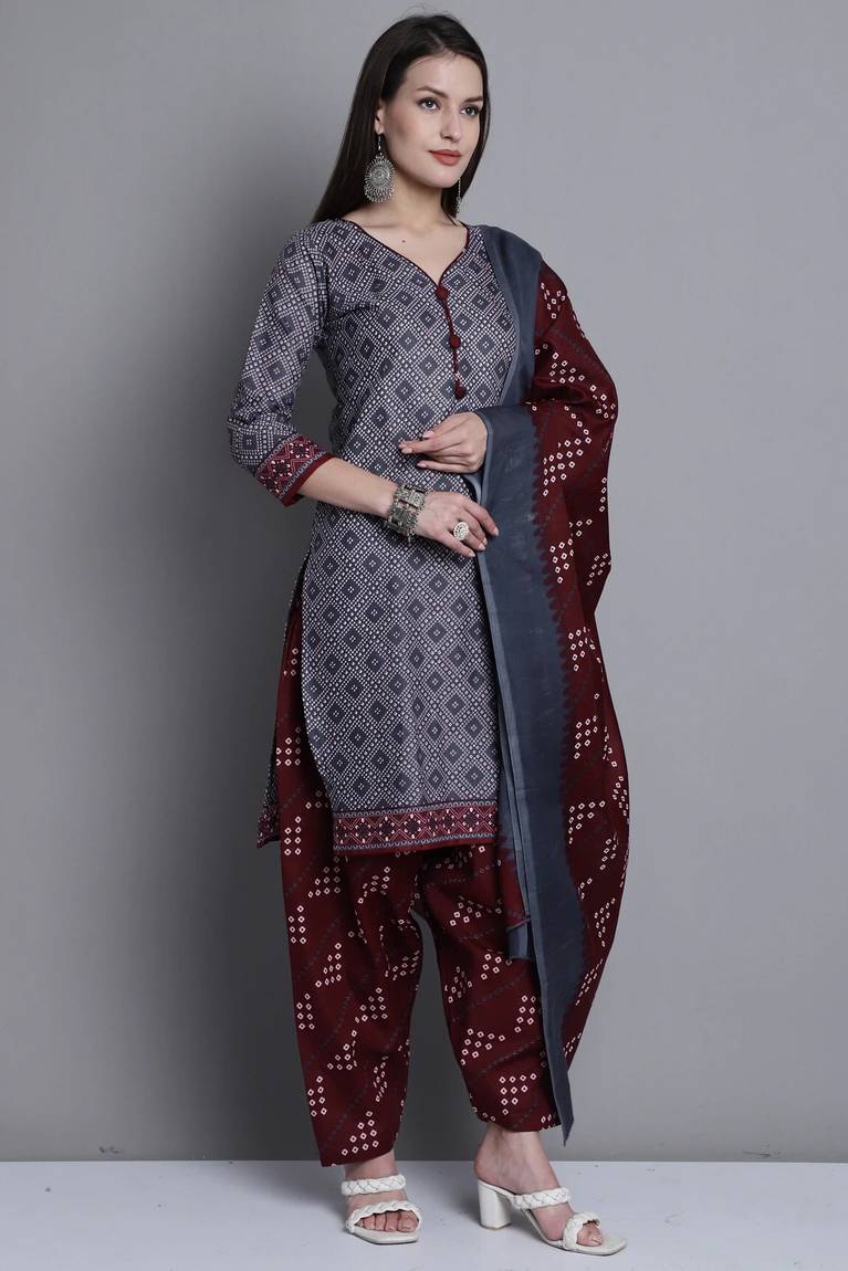 Beautiful Suit look pretty like never before.Wearing this Grey Color Suit which made from Rajnandini with Maroon Colored Printed Cotton Blend Bottom and Grey & Maroon Colored Cotton Blend Dupatta.Suit has also decorative work like Top - Bandhej Print, Bottom - Bandhej Print And Dupatta - Bandhej Print.This beautiful suit features a classy Printed Work all over,which makes it a smart pick for all occasions. You can wear this Suit in different styles. You can wear it occasionally or casually.