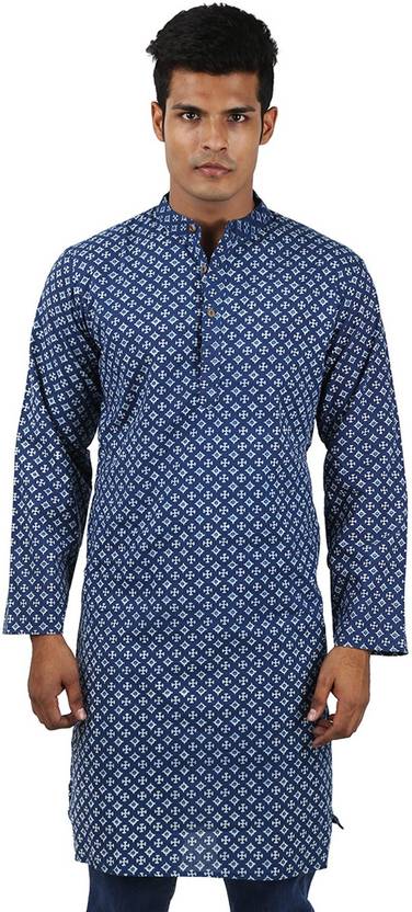 RAJRANG Men Geometric Print Cotton Blend Flared Kurta (Blue)