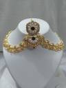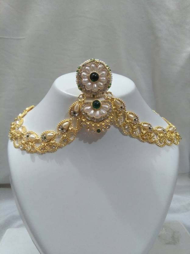 Gold Plated White Moti Mangtika/Rakdi With Green Stones.