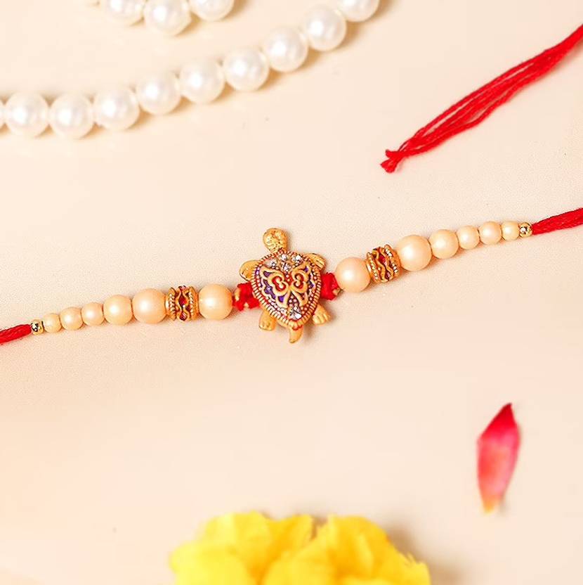 Tortoise makes a great symbol of longevity and endurance. Bring good fortune to your brother's life by tying this elegant design to the tortoise rakhi. Beautifully designed with an oxidised tortoise in oxidised metal and embellished with pearls on the sides, it is a perfect pick to adorn the wrist of your brother. #this rakhi comes with a card. #This Rakhi gift has seeds embedded that can be grown into a beautiful plant