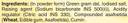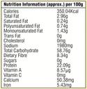 Total Fat 2.96 g, Saturated Fat 0.24 g, Polyunsaturated Fat 0.74 g, Monounsaturated Fat 1.43 g, Trans Fat 0 g, Cholesterol 0 mg, Sodium 1980 mg, Total Carbohydrate 58.76 g, Dietary Fibre 8.34 g, Sugars 0 g, Protein 22.09 g, Vitamin A 8.57 mg, Vitamin C 0 mg, Calcium 50.38 mg, Iron 5.43 mg
