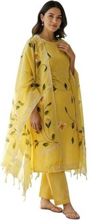 The set includes a hand-painted linen top, a matching dupatta with a shimmering silver zari border, and a comfortable cotton bottom fabric—perfect for custom tailoring. Whether it’s festive wear, office functions, family gatherings, or casual outings, this suit set adds sophistication to every occasion.