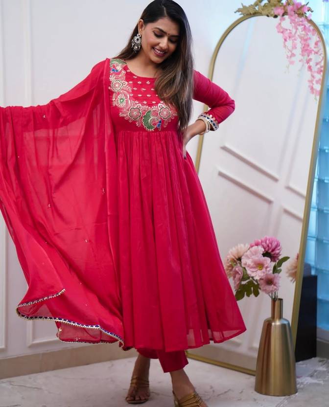 Graceful RED Anarkali Set with Matching Palazzo and Dupatta Radiate elegance with our stunning RED Anarkali set, a perfect blend of traditional charm and contemporary sophistication. This ensemble features: Anarkali Kurta: Designed with a smart neckline, this Anarkali kurta offers a flattering silhouette that gracefully flares to enhance your look. The vibrant yellow hue adds a cheerful, timeless appeal. Matching Palazzo: Complementing the kurta, the matching palazzo ensures comfort and ease of movement, making it an ideal choice for festive occasions or all-day wear. Coordinated Dupatta: Complete the look with the beautifully matched dupatta, adding an extra touch of elegance with its lightweight design and delicate detailing. Perfect for festive celebrations, weddings, or evening gatherings, this Anarkali set is crafted from premium-quality fabric to provide all-day comfort and style. Pair it with statement earrings and ethnic footwear to make a lasting impression.