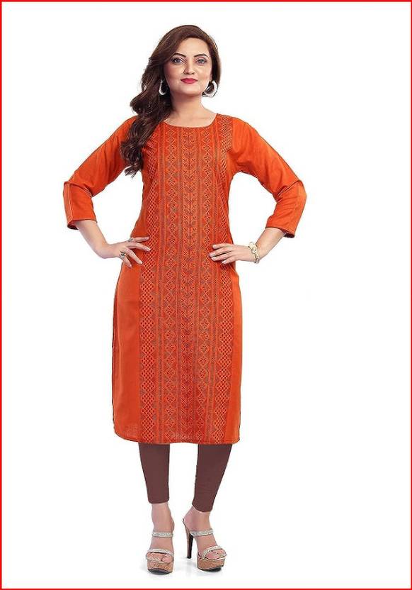 Women Printed Cotton Blend Straight Kurta (Orange)
