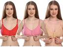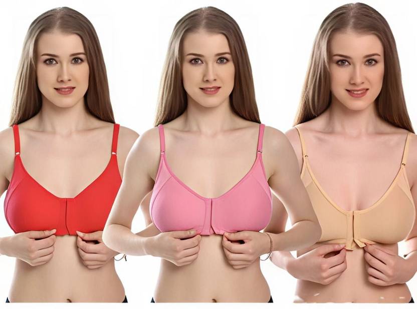 Experience everyday comfort with this 3‑piece set of women’s cotton brassieres. These non‑padded, non‑wired front‑open bras feature deep‑panel construction and molded cups for a natural, supportive fit. Designed for moderate coverage and seamless wear, they offer effortless everyday styling in vibrant multicolours.”