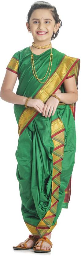 Bhartiya Paridhan Girls Ready To Wear Stitched 9 Var Peshwai Mastani Saree With Stitched Blouse. Fulfill your little girl, dream of dressing up just like you by gifting her this saree from Bhartiya Paridhan. Beautified with neat Jari Border work, this saree will become her favourite instantly. Keeping in mind the delicate skin of your little one, this saree is fashioned from soft Art Silk fabric. Furthermore this ready to wear saree comes with a stitched blouse