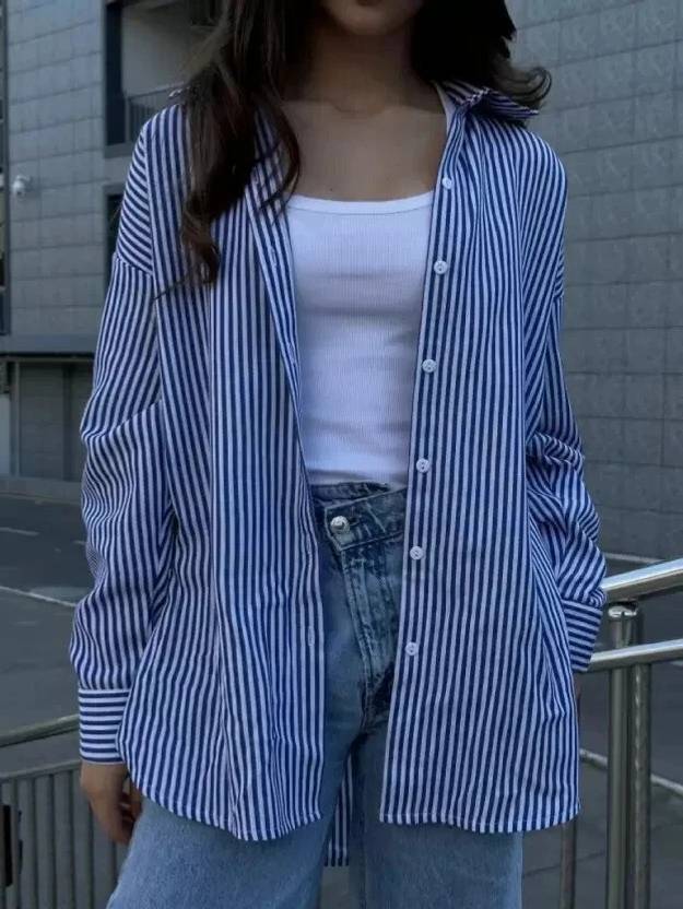 This is a stylish pure cotton shirt featuring a all-over stripe print. It offers a spread collar and cuffed sleeves, combining comfort with classic design.