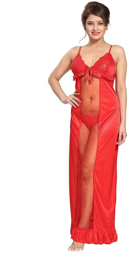 Make yourself hot & mesmerize with this Premium 28 Gaz Satin Nighty and Bikni from Rangmor Fashions. It has designed with Satin and Lycra lace on Bust with satin frills at under bust In front for making nights memorable Soft Net is there. It has adjustable shoulder straps for perfect fitting. This Nighty is the ultimate blend of comfort and style. 1 Pcs Of Matching Bikni is with this Nighty. Length Full Approx-54 inches. Size-Medium Perfect For Bust 32-34 Inches & Large - Perfect For Bust 34-36 Inches Only.