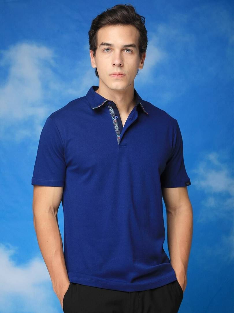 Men Solid Polo Neck Pure Cotton Blue T-Shirt