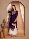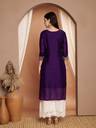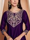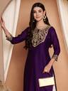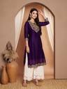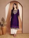 Make a royal style statement with this elegant kurta set. The straight purple kurta is crafted in a smooth silk-blend fabric that drapes beautifully and gives a rich festive look. The front yoke is highlighted with intricate golden zari and thread embroidery, enhanced with tiny stone detailing and a unique twin-bird pattern that draws all the attention to the neckline. Embroidered sleeve hems and scalloped work along the kurta border add a designer touch.
