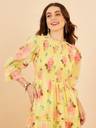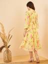 yellow floral midi fit and flare dress, has a high neck, long sleeves, regular sleeves, flared hem
