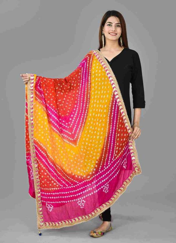 This Rajasthani Bandhej Print Dupatta with Gota Patti Border has been prepared by our designers to give you a "Traditional" and "Trendy" look. Couple this Women's Jaipuri Bandhej Dupatta with an evening dress or traditional dress to enhance your look in the Party. Bring Home a piece of luxury and class.Jaipuri Art Silk Bandhej Printed Dupatta With Heavy Gota Patti Lace From Rashi creation.