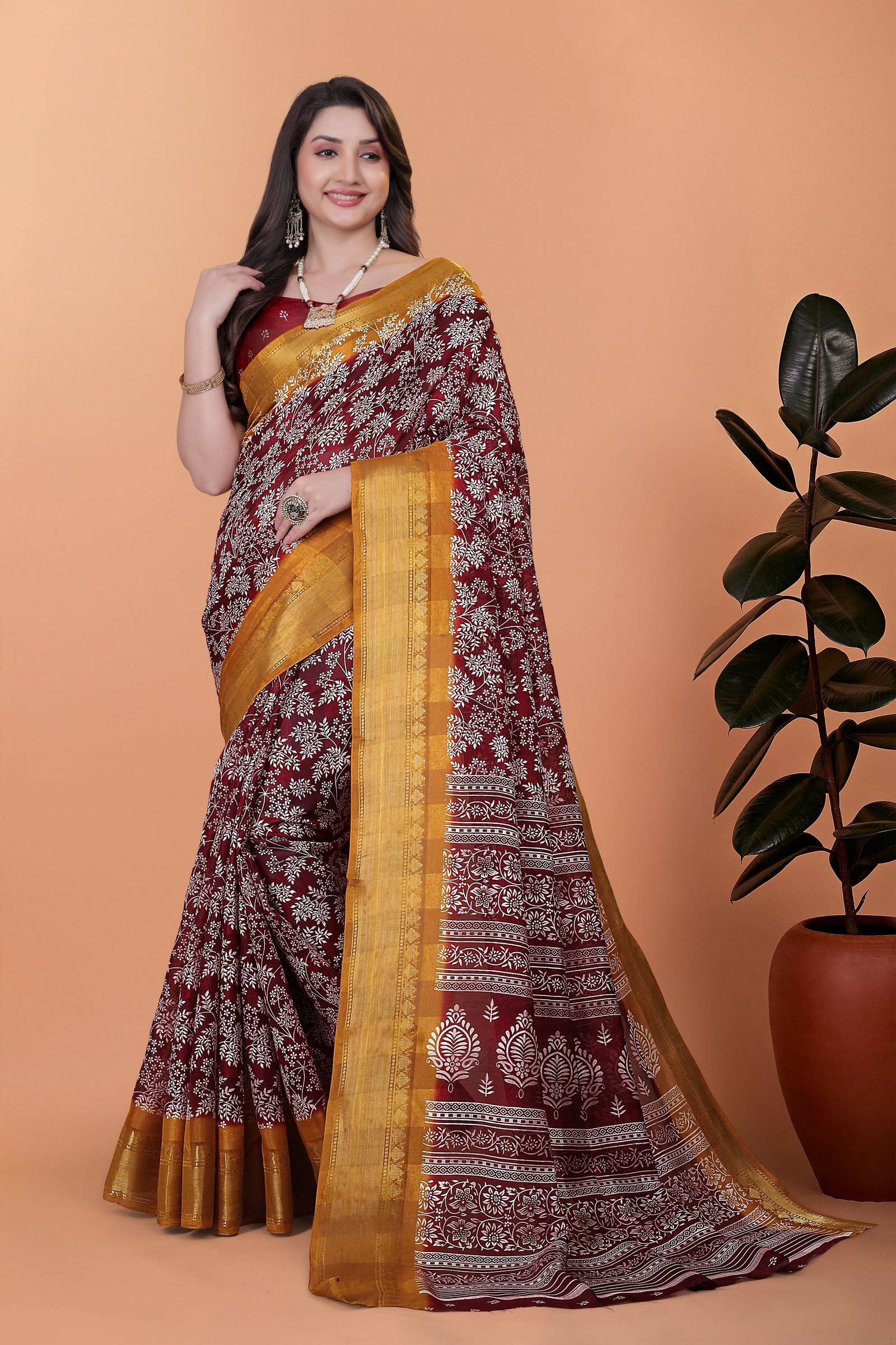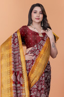 Thanks to its versatile design, this saree can suit a wide range of settings, from daytime outings to festive events and casual celebrations. Depending on the choice of accessories and draping style, it can reflect a refined, traditional look or a contemporary presence. Thus, its lightweight feel, combined with the thoughtful print and breathable fabric, allows for styling flexibility across seasons and settings.