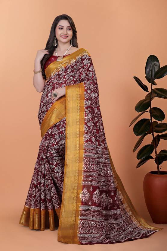 RASIFASHION Printed Chanderi Cotton Blend Saree (Maroon)