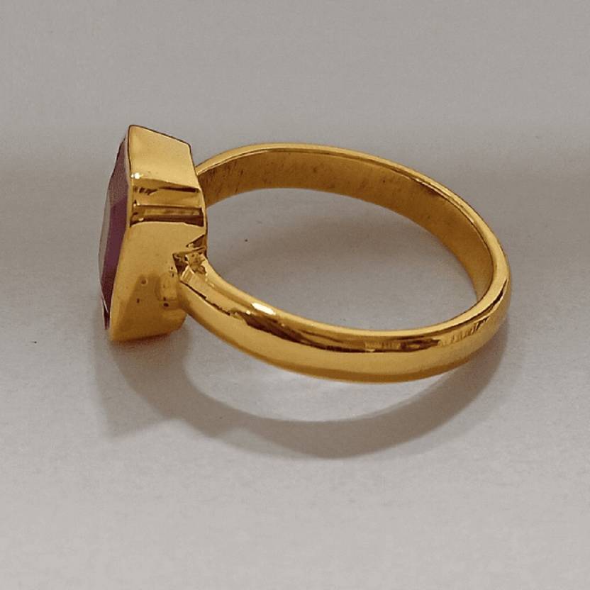 BENEFITS : Adorn your fingers with the brilliance of this gold-plated Ruby (Manik) stone ring, crafted for those who seek both elegance and astrological benefits. Designed with a high-quality, premium-grade Ruby gemstone, this ring enhances confidence, vitality, and success, making it an ideal astrology and birthstone ring.The deep red hue of the Ruby symbolizes passion, energy, and strength, making it a powerful gemstone for those born under the influence of the Sun. Set in a durable and lustrous gold-plated frame, this ring is a perfect blend of tradition and sophistication, ideal for both daily wear and special occasions.