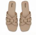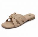These elegant beige slide sandals feature a chic criss-cross strap design on the upper, accented with a stylish gold-toned buckle. The flat sole provides comfort for everyday wear, and the textured bottom ensures good grip. The open-toe and open-back design makes them easy to slip on and off. These versatile sandals are perfect for pairing with casual dresses, shorts, jeans, skirts, and capris for a relaxed yet fashionable look.