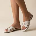 These women's flat slide sandals feature a stylish criss-cross strap design in a soft pink hue, accented with a prominent gold-toned D-ring buckle. The open-toe and open-back construction ensures ease of wear, while the flat sole provides comfort for everyday use. The outsole is textured for improved grip. These versatile sandals are perfect for casual outings and can be paired with a variety of outfits including casual dresses, shorts, jeans, and skirts. They would complement accessories such as a casual tote bag, a crossbody purse, or simple jewelry.