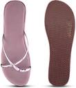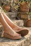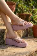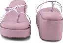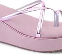 These stylish pink wedge sandals feature a comfortable platform sole and thin, iridescent criss-cross straps with a toe ring design. The solid pink wedge provides elevation, while the textured brown outsole offers grip. These sandals are perfect for adding a touch of modern elegance to your casual outfits.