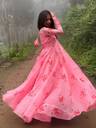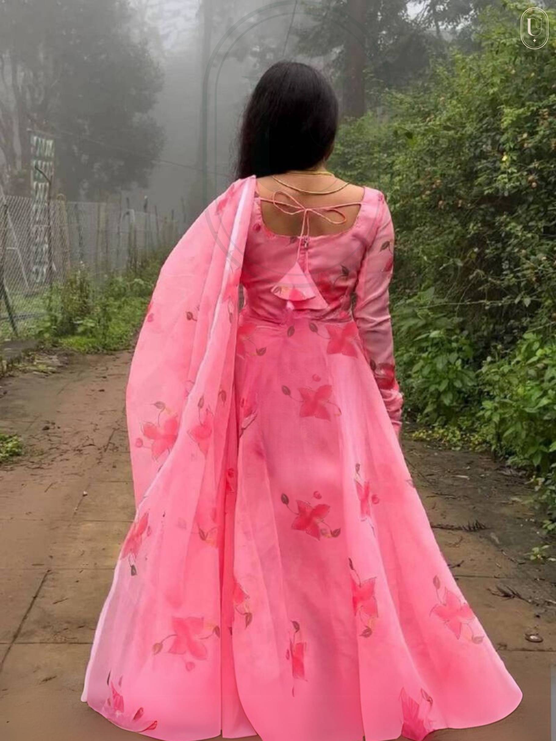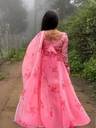 Fabric: The gown appears to be made of lightweight and flowy fabric, possibly chiffon or georgette, giving it a graceful and airy look., Dupatta Design: The dupatta is semi-sheer and adds an elegant drape to the outfit. It has a thin, shiny border, which subtly enhances its look without overpowering the design., Features: Comfortable, breathable, and elegant., Occasion: Perfect for weddings, receptions, and festive events., Setting: The minimal and airy background includes white curtains, a potted plant, and a wooden floor lamp. These elements enhance the soft, romantic aesthetic of the image., Styling: Pairs well with statement earrings and ethnic footwear.