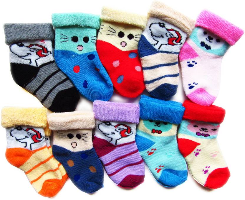 New Born Kids Socks(0-8 Months) Pack Of 10 In Assorted Colors And Mix Designs, Made From Softest Cotton Yarn And Spandex For Elasticity. Do Not Iron Or Bleach. Hand Wash Only.