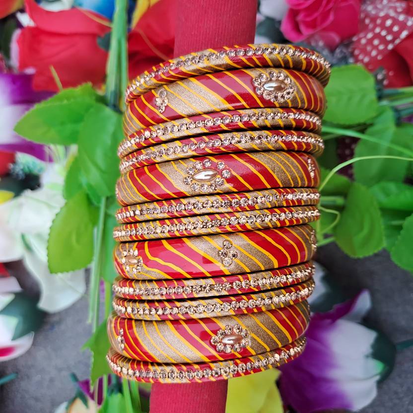 Elevate your style with these exquisite bangles, crafted with precision and adorned with intricate details. The base material, lac, lends a traditional touch while the gold-plated under-ring adds a hint of opulence. The vibrant multicolored palette ensures versatility, making it the perfect accessory for all occasions. Each bangle is delicately embellished with shimmering stones in a mesmerizing laheri cut, adding a touch of glamour to your ensemble. Whether worn to a festive celebration or a formal gathering, these bangles radiate elegance. Gift this timeless piece to her, a symbol of love and sophistication, making every moment special.