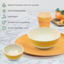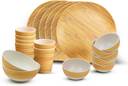This dinner set includes 11" plates 6 pieces , 4" bowls 6 pieces , 5.5 inch bowl 2 piece and 380ml tumblers 6 piece . Made from bamboo, these pieces are chemical-free, lightweight, unbreakable, stain-free, and microwave and dishwasher safe. With natural food-grade colours, they add style and are eco-friendly and biodegradable. They shine more with each wash and are easy to use and maintain. Experience the brilliance of these pieces on your dining table.