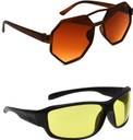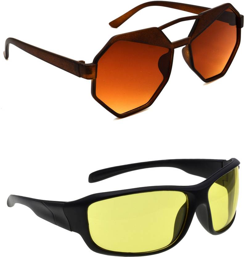 Brown & Black Frame Brown & Yellow Non Polarized Lens Classic Cool Trendy New Designer Stylish & Eye Protection Round Sunglass Combo Goggles Latest Model Optical Shades Unisex Chashma Medium Day & Night Vision Sunglasses for Drivingfor Men Women Boys & Girls