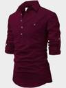 This short kurta with a collared design and a chest pocket. The shirt has a half-placket button closure that goes halfway down the chest, providing a casual yet sophisticated look. The buttons on the placket and chest pocket are visible, and the sleeves are rolled up, secured with a button tab, adding to the relaxed style. The fabric appears to be light and comfortable, suitable for warm weather or casual outings. This style combines traditional elements of a kurta with a modern, casual twist.