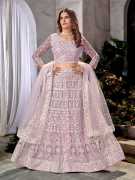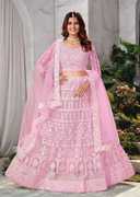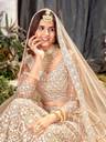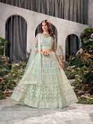 The choli (blouse) comes in a matching hue with elaborate all-over embroidery, a stylish V-neckline, and full sleeves, offering a regal yet modern silhouette. A lightweight net dupatta, adorned with delicate embroidered lace borders, completes the set, adding a sheer layer of sophistication.