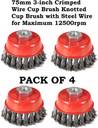 REIOENT HIGH QUALITY 75mm 3-inch Crimped Wire Cup Brush Knotted Cup Brush Wheel Brush (Pack of 4)