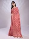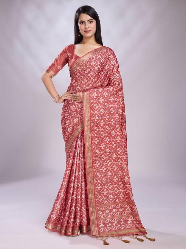 Elevate your style with the RekhaManiyar Coral Silk Blend Saree featuring a stunning geometric print and sequined border, complemented by an unstitched printed blouse for a chic look.