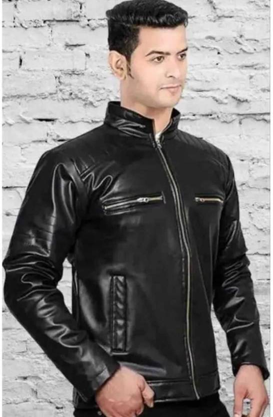 This stylish regular fit jacket in the display has full sleave and stand collar. Inside one pocket and branded zippers, this faux leather jacket is light in weight and will ensure cofort all time.
