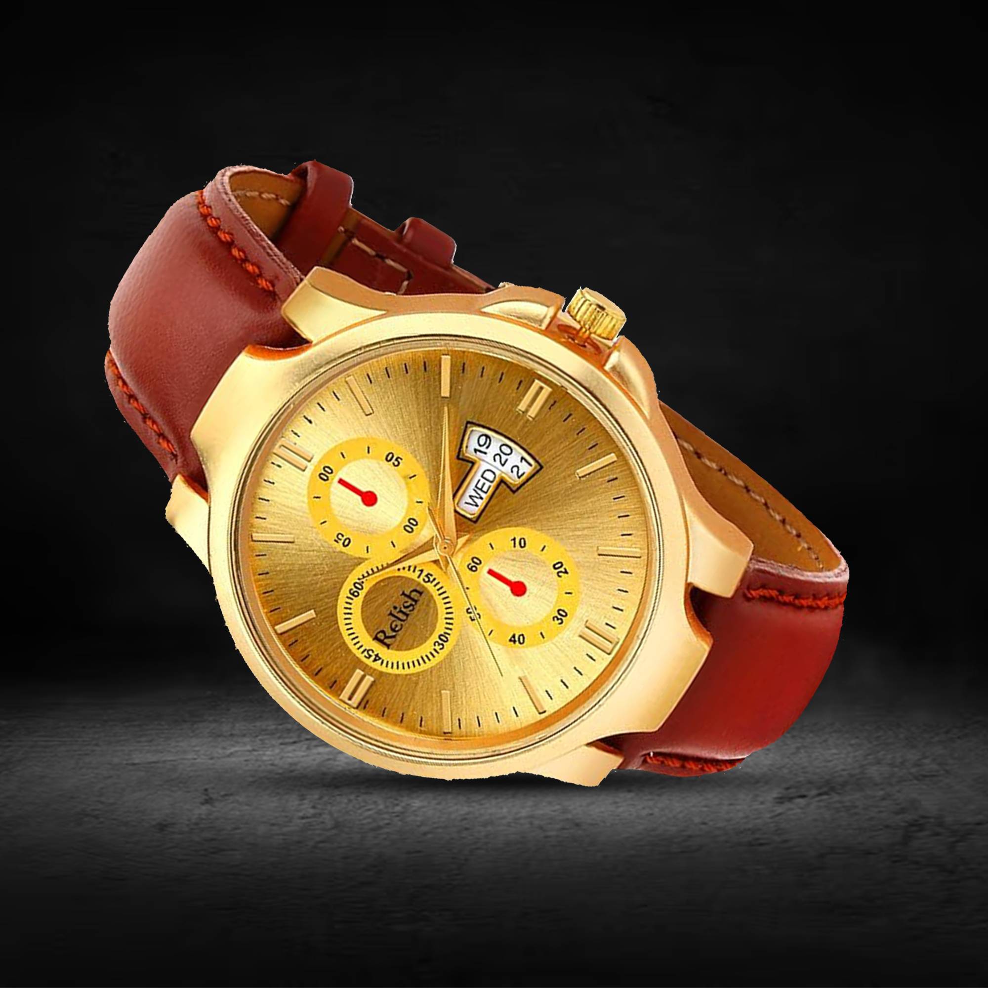 RELish Original Gold Plated Day & Date Functioning, Brown Strap Premium Quality Analog Watch - For Men