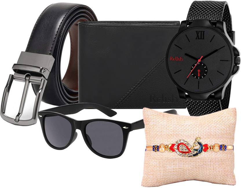 Relish Designer Wallet, Watch, Belt, Sunglasses With Rakhi Combo for Brother Mauli Thread Rakhi, Wallet, Watch, Belt, Goggle, Chawal Roli Pack Set (1 Rakhi, Watch, Wallet, Belt, Sunglasses, Roli & Chawal)