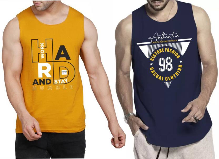 RestoreĀ Pack of 2 Men Graphic Print Round Neck Cotton Blend Navy Blue, Yellow T-Shirt