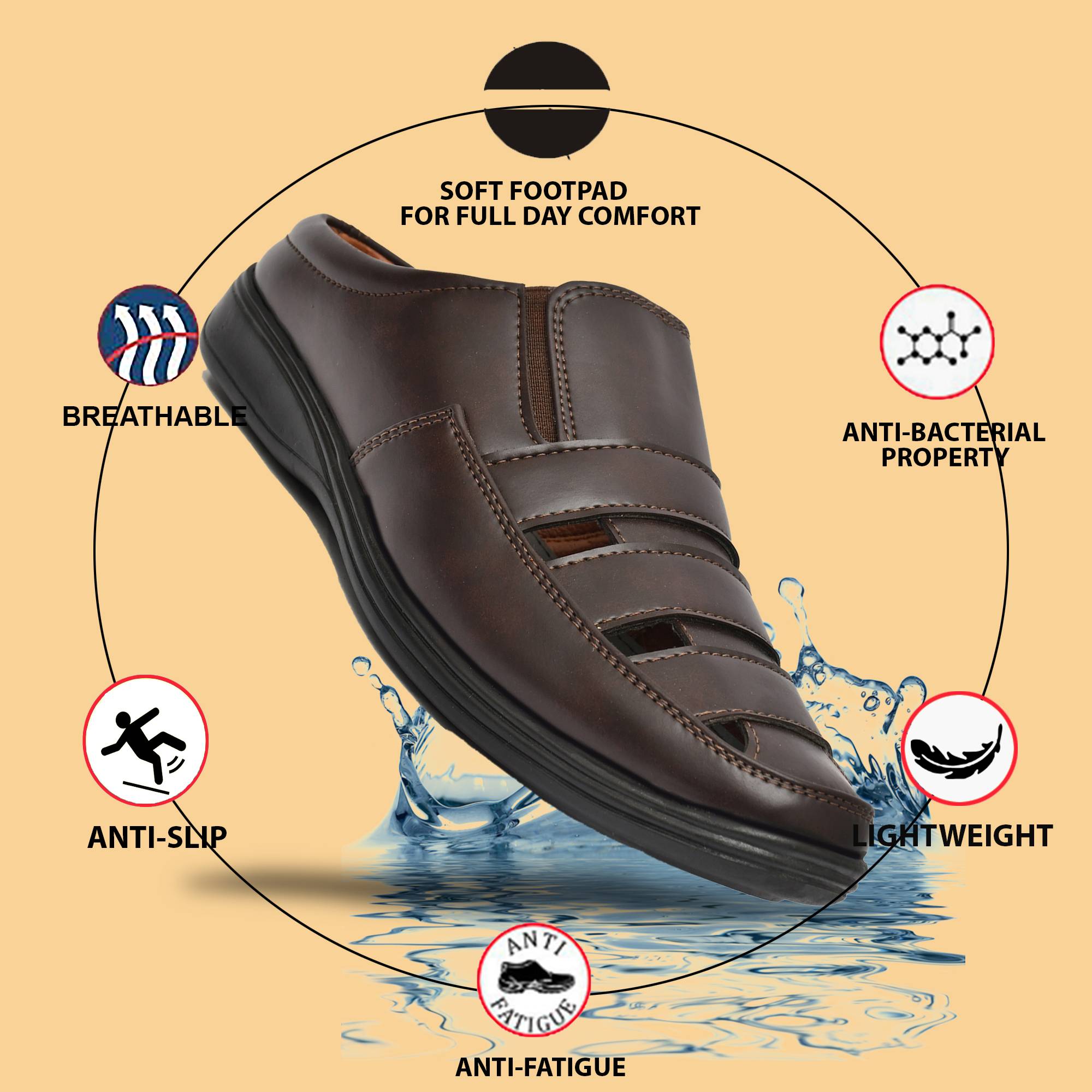 Restroad Upgrade your footwear collection with these premium All Synthetic Leather slip-on sandals, designed for ultimate comfort and style. Featuring a closed-toe design with breathable cut-outs, these sandals offer a perfect blend of sophistication and practicality, mak