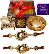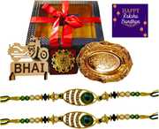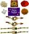 Celebrate the joyous occasion of Raksha Bandhan with our exquisite Designer Peacock Feather Eye American Diamond Meena Kundan Work Rakhi set for Bhaiya and Bhabhi. Adorned with sparkling American diamonds, intricate Meena work, and Kundan embellishments, these rakhis depict the grace and beauty of a peacock feather eye. This set includes 2 rakhis, allowing you to celebrate the bond with your Bhaiya, Bhabhi, and two additional family members. Let's explore the remarkable features of this exceptional Rakhi package. Celebrate Raksha Bandhan with grace and style using our exclusive Designer Peacock Feather Eye American Diamond Meena Kundan Work Rakhi set. Make this occasion truly unforgettable for your beloved Bhaiya, Bhabhi, and your entire family!