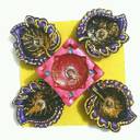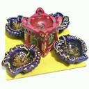 Material: Terracotta Colour: Multi-Color Product Dimensions (L x W x H): 8 cm x 6 cm x 4 cm (Diya), 8 cm x 6 cm x 6 cm (Diya), 7.5 cm x 3.5 cm x 1 cm (Sricharan) Package Contents: 4 Diyas, 1 Tulsi Diya, 1 Pair of Sricharan