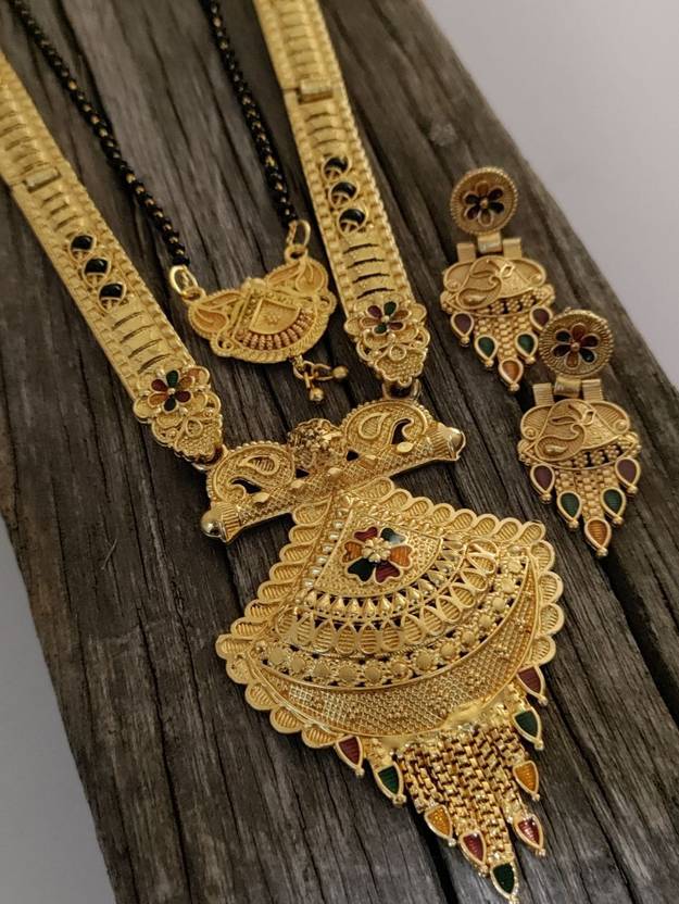 Add elegance and tradition to your jewelry collection with this exquisitely crafted gold-plated mangalsutra set. The intricate detailing, floral motifs, and vibrant enamel accents make it a timeless piece perfect for weddings, festive occasions, and traditional functions. This set includes a beautifully designed mangalsutra with black beads and a matching pair of earrings, all featuring peacock and floral patterns that reflect Indian heritage craftsmanship. Care Instructions:- Avoid water, perfumes & chemicals. Store in a dry place