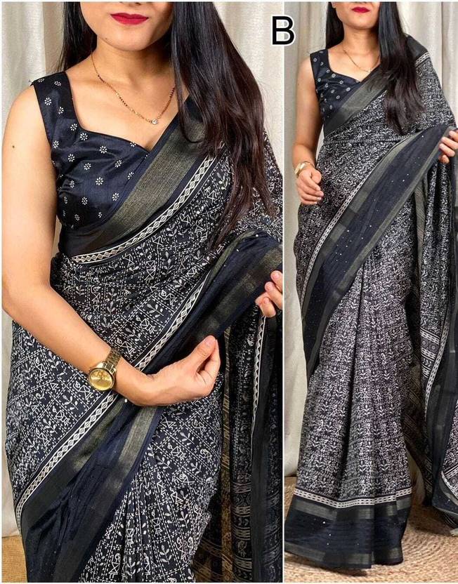 Ridham Printed Kalamkari Silk Blend Saree (Black)