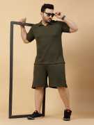 RIGO presents men's PLUS SIZE solid CO-ORDS made from rich textured waffle knit fabric. The Black Co-ords is a spring/summer wardrobe essential, perfect for your outgoing look. It features solid pattern, has t-shirt with polo neck, half sleeves, curved hem, and shorts with drawstring closure, side pockets and regular fit. Team it up with a pair of sneakers for a stylish look and stay looking sharp and comfortable this spring/summer in these co-ords. Constructed from rich textured material, it's perfect for outdoor trips and hot weather. As a bonus, its regular-fitting design ensures comfort all day long.
