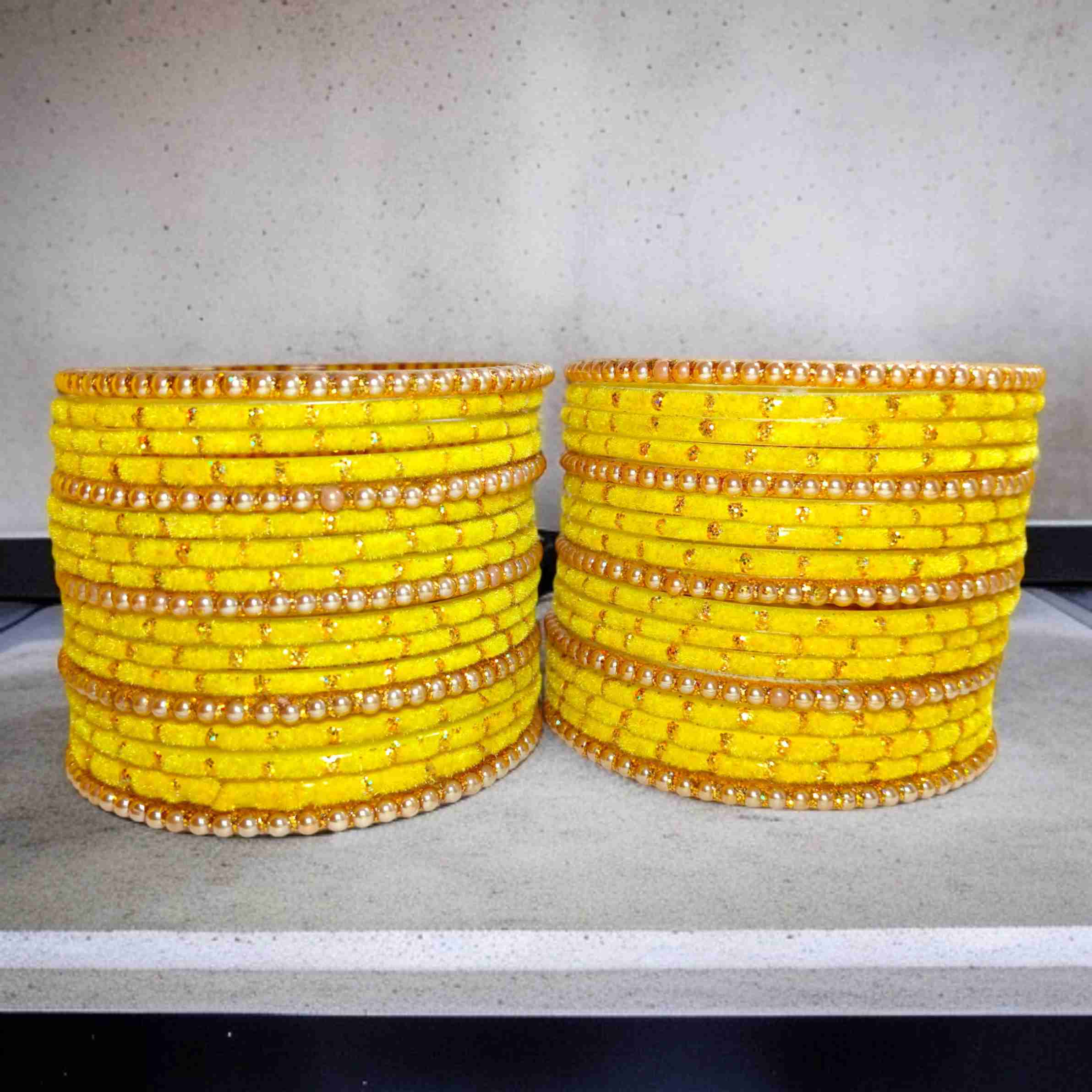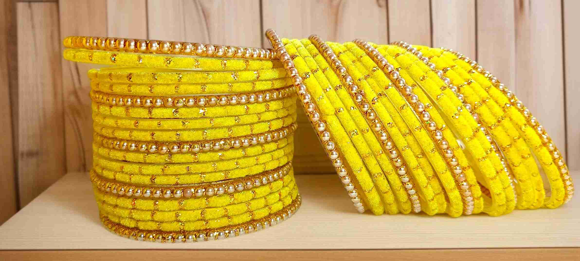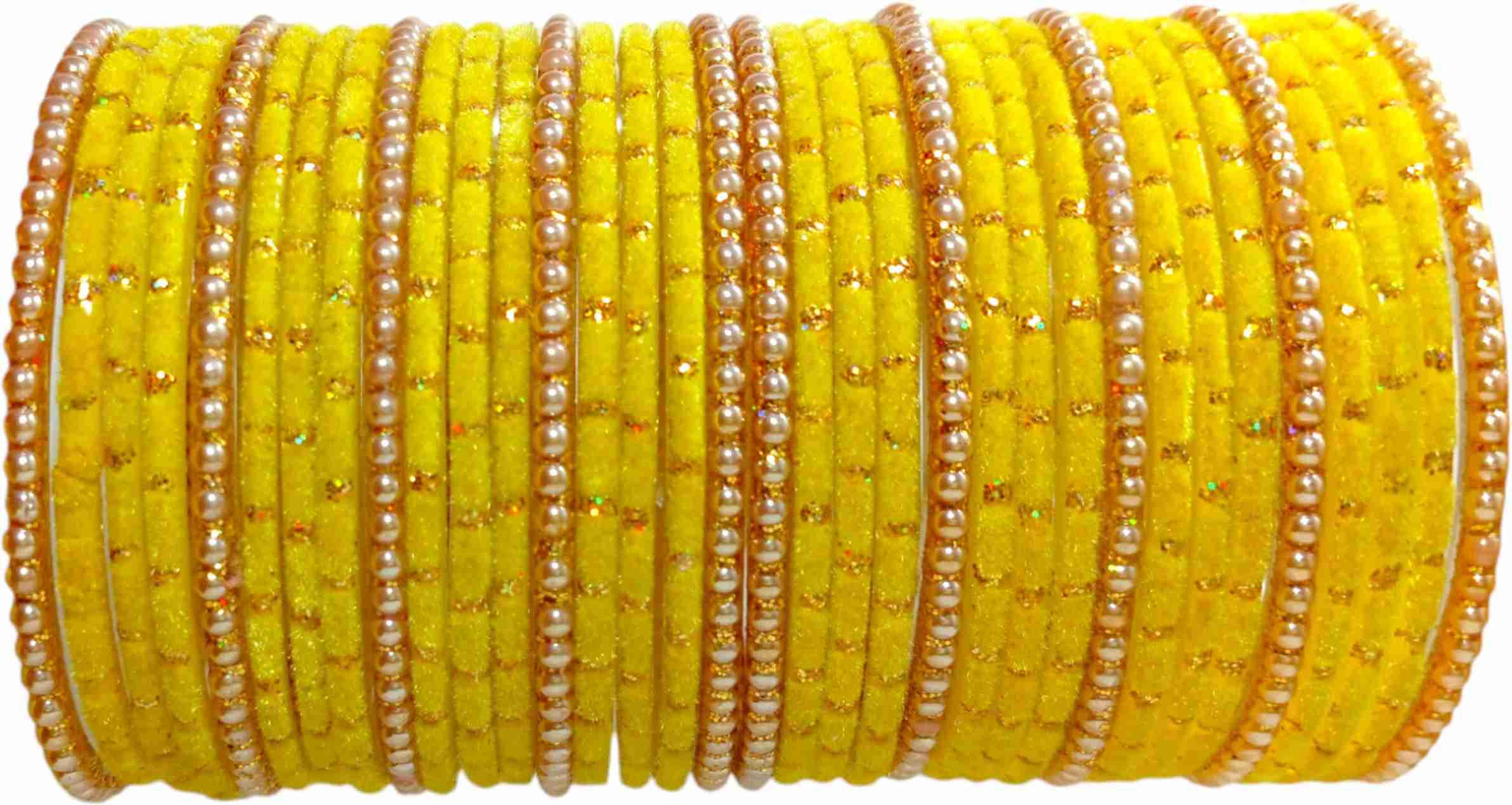 These Traditional & Fashionable Velvet Or Beads Studded worked Glossy Finished Glass Bangle set can make your hands pretty and attractive. These Bangle set are from The Latest Collection of "RIJB". It...