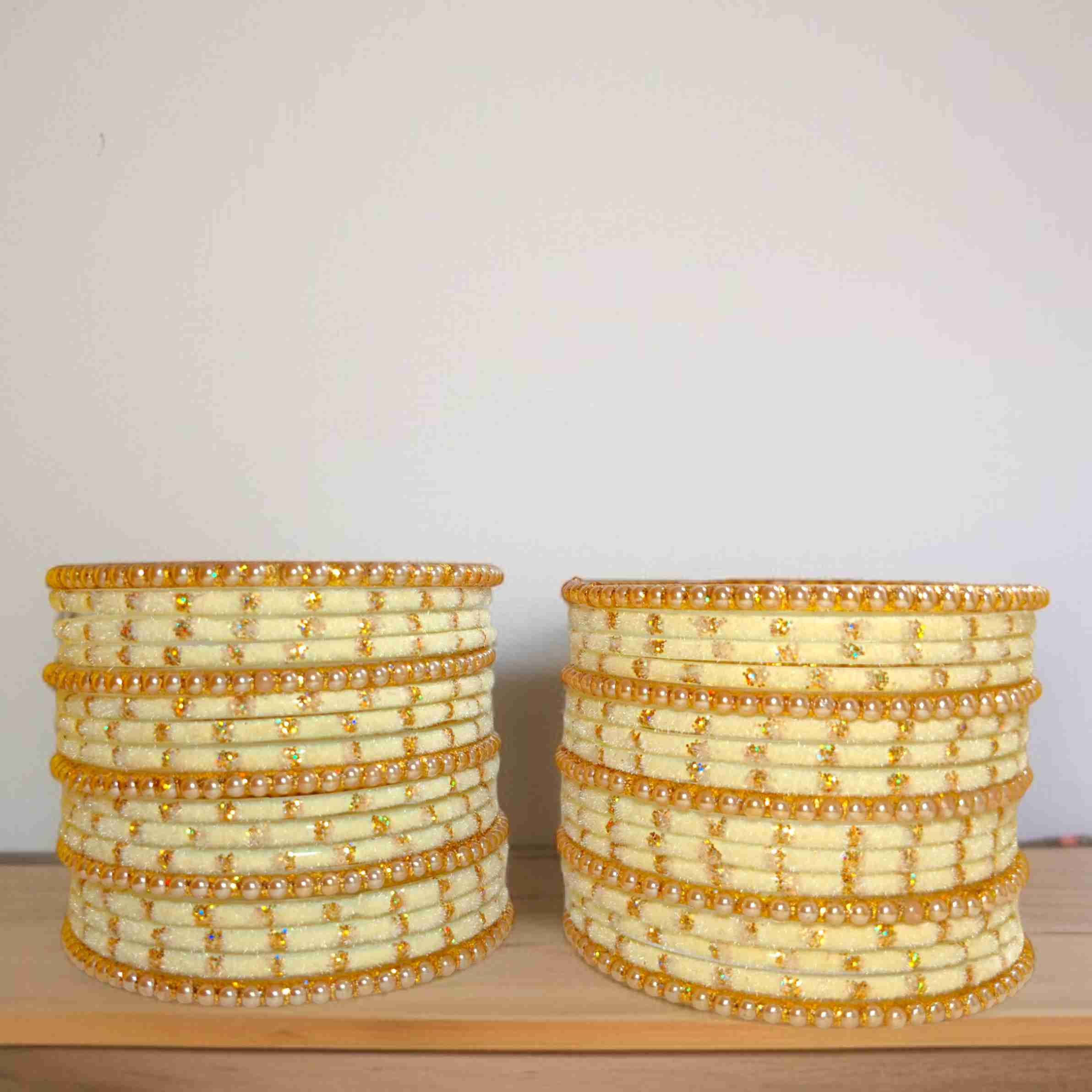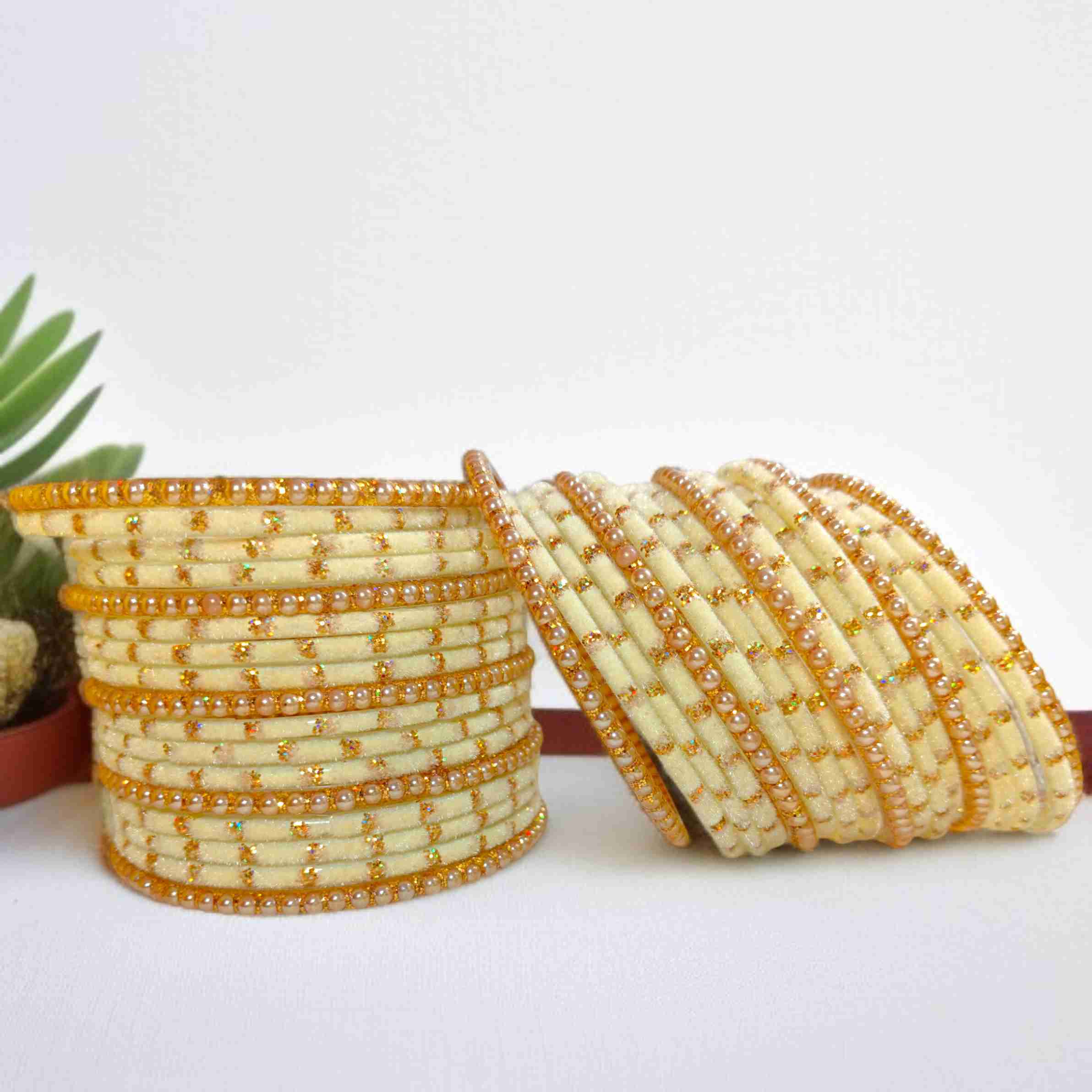 These Traditional & Fashionable Velvet Or Beads Studded worked Glossy Finished Glass Bangle set can make your hands pretty and attractive. These Bangle set are from The Latest Collection of RIJB. It's...