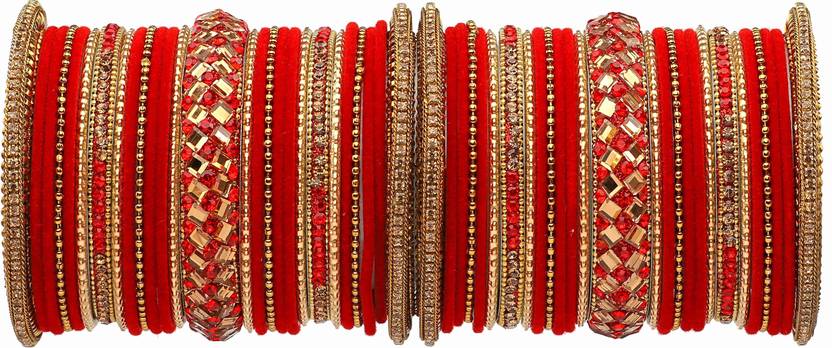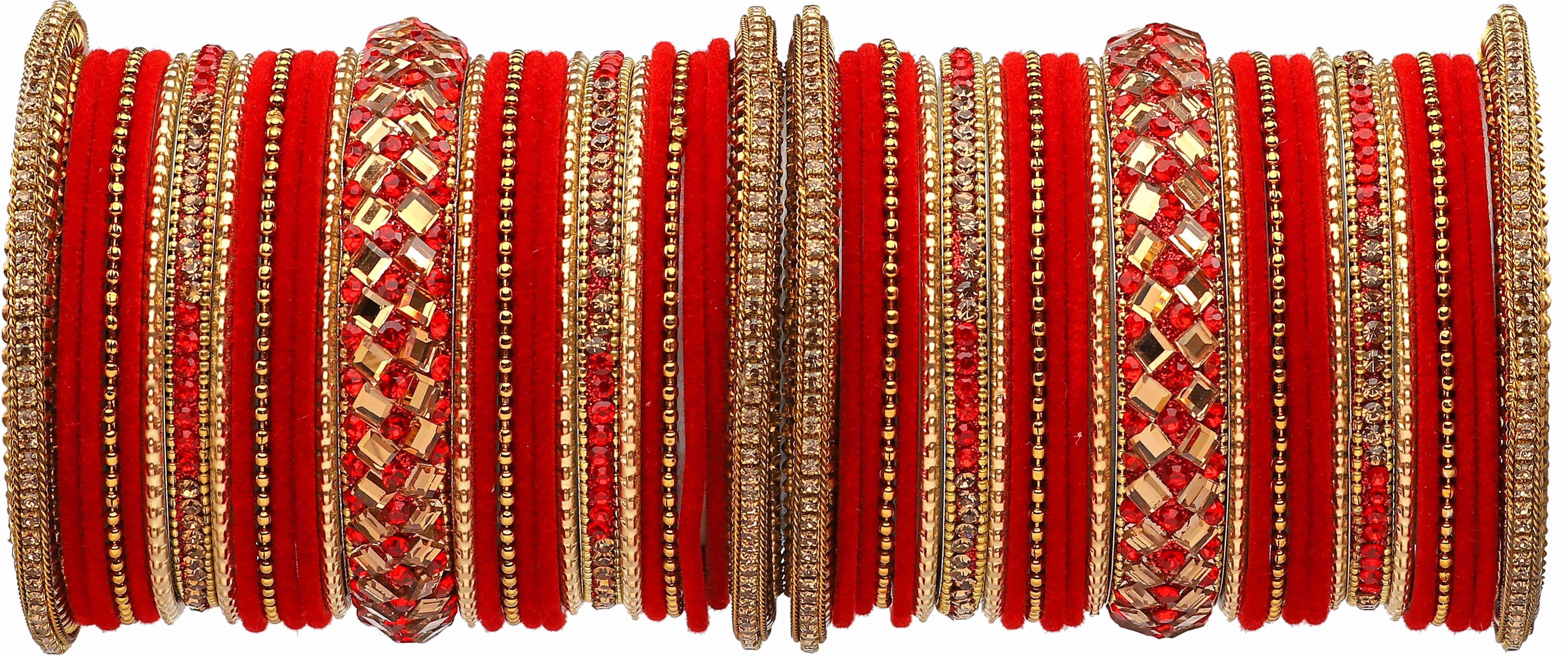 PRODUCT DETAILS: - This elegant charming bangle set is Red in color having whitish Golden Colored zircon Gemstone studded Kada with velvet bangles in middle giving you a gorgeous Look. This bangle set is available in pack of 54 bangles which is all set to make you feel ethnicity. SIZES: - This bangle set is available in three sizes - 2.4/2.6/2.8. QUALITY & PRICE: - We are always take stringent measures on product quality by maintaing its price. We assure you that our products are supreme in quality that is non-allergic and Budget friendly too. IDEAL GIFT: - Gifts are meant to express love and affection which can brings smile on your loved ones face. Bangles are more than the ornaments and thus perfect gift for your wife, sister, daughter, mother. OCCASION TO WEAR : - These bangles are shimmering having glitter/glossy finish and you can wear them in weddings, festivals, parties, karwachauth, diwali, raksha bandhan etc. ABOUT RIJOLI: - We aim at reforming the fashion trends at reasonable cost in India with our exclusive bangles collection. We are focussed to offer excellent customer experience that can make your everday special. JEWELLERY CARE: - Its always necessary to take care of your jewellery accessories for enjoying them longer, so avoid there contact with perfumes and sprays, Always store them in moist free and dirt free box, Use soft cloth to clean them.