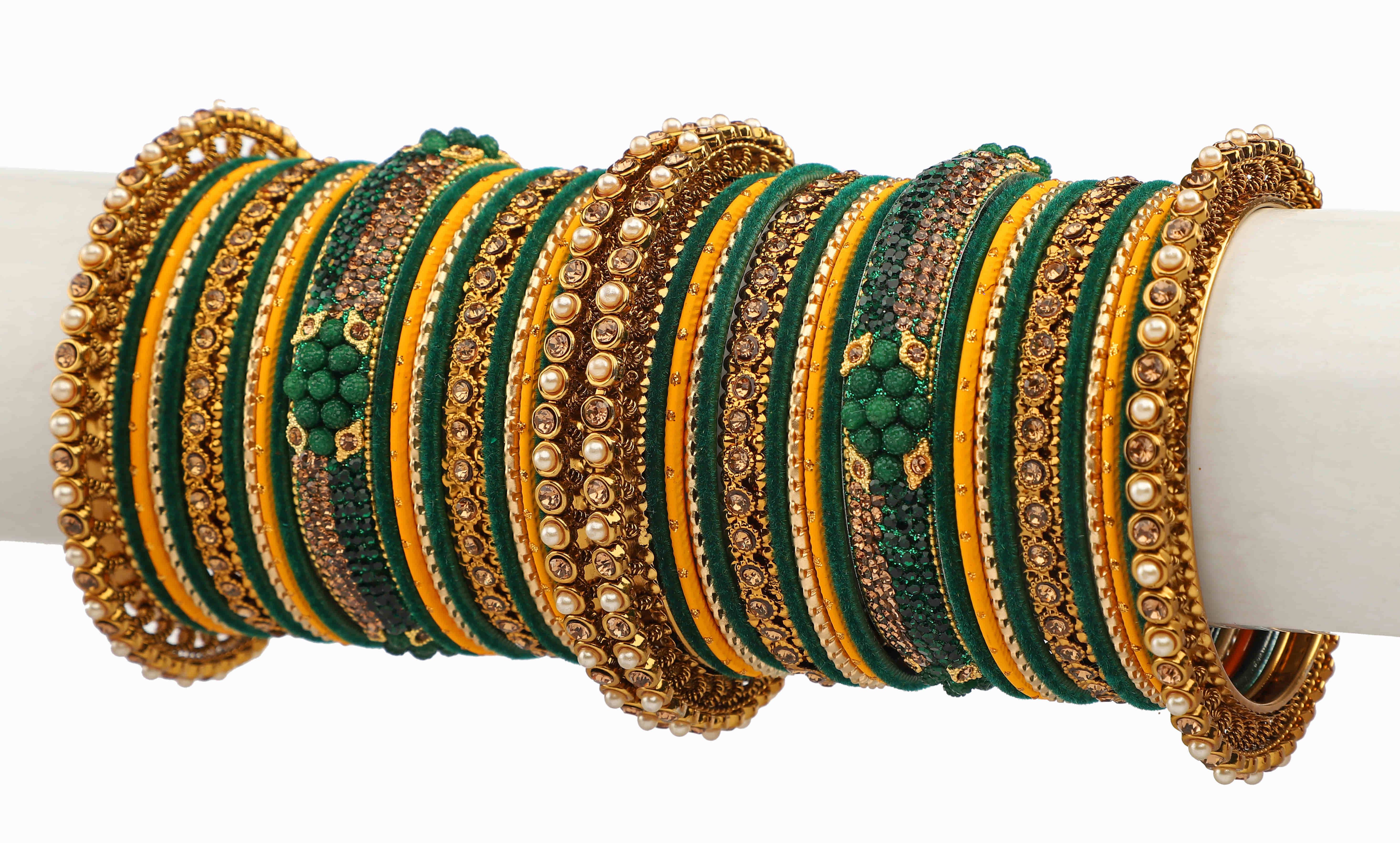 PRODUCT DETAILS: - This Exclusive bangle set is in Green and Yellow color having Golden Colored zircon Gemstone & Pearl studded Kada in sides with antique zari-worked kada in middle having velvet and molding bangles giving you an elegant persona. This Double Colored bangle set is available in pack of 42 bangles which offers you a more complete ethnic and charming look. SIZES: - This bangle set is vaialble in three sizes - 2.4/2.6/2.8. QUALITY & PRICE: - We are always take stringent measures on product quality by maintaing its price. We assure you that our products are supreme in quality that is non-allergic and Budget friendly too. IDEAL GIFT: - Gifts are meant to express love and affection which can brings smile on your loved ones face. Bangles are more than the ornaments and thus perfect gift for your wife, sister, daughter, mother. OCCASION TO WEAR : - These bangles are shimmering having glitter/glossy finish and you can wear them in weddings, festivals, parties, karwachauth, diwali, raksha bandhan etc. ABOUT ZINEKA: - We aim at reforming the fashion trends at reasonable cost in India with our exclusive bangles collection. We are focussed to offer excellent customer experience that can make your everday special. JEWELLERY CARE: - Its always necessary to take care of your jewellery accessories for enjoying them longer, so avoid there contact with perfumes and sprays, Always store them in moist free and dirt free box, Use soft cloth to clean them.