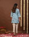 Step into effortless elegance with this round neck cotton printed aqua green short kurti, designed for the modern woman who seeks both comfort and style. The soothing aqua green hue adds a refreshing pop of color to your wardrobe, making it perfect for casual outings and sunny days.