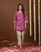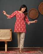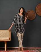 Crafted from soft, breathable cotton, this kurti ensures maximum comfort while keeping you looking chic all day long. The round neckline offers a classic, flattering fit, while the vibrant prints add a touch of personality and charm. The short length creates a playful silhouette that pairs beautifully with jeans, leggings, or skirts.